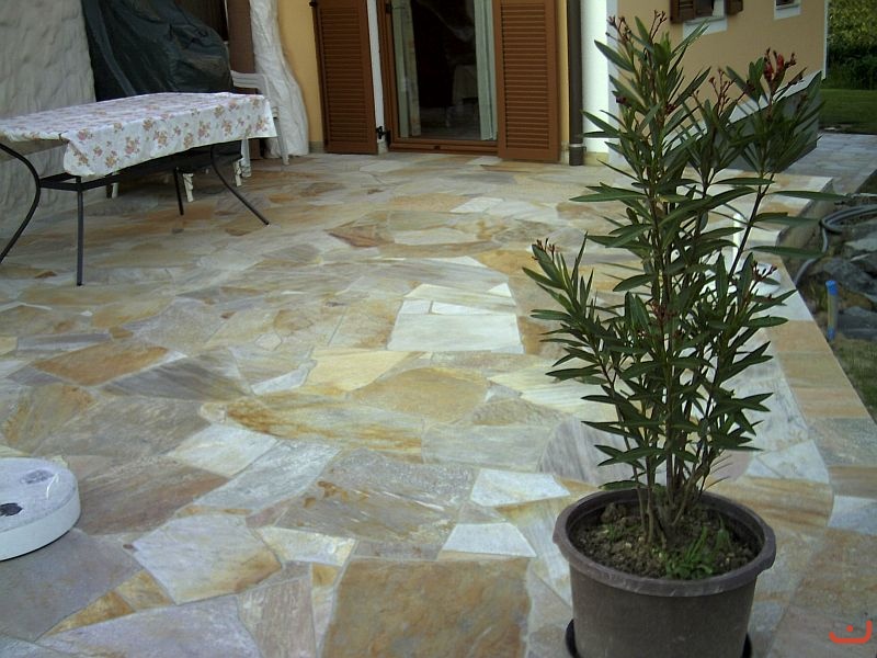 Material: Quarzit hellgelb; Aussenanwendungen; Polygonalplatten (9840), Sockelleisten (9830)