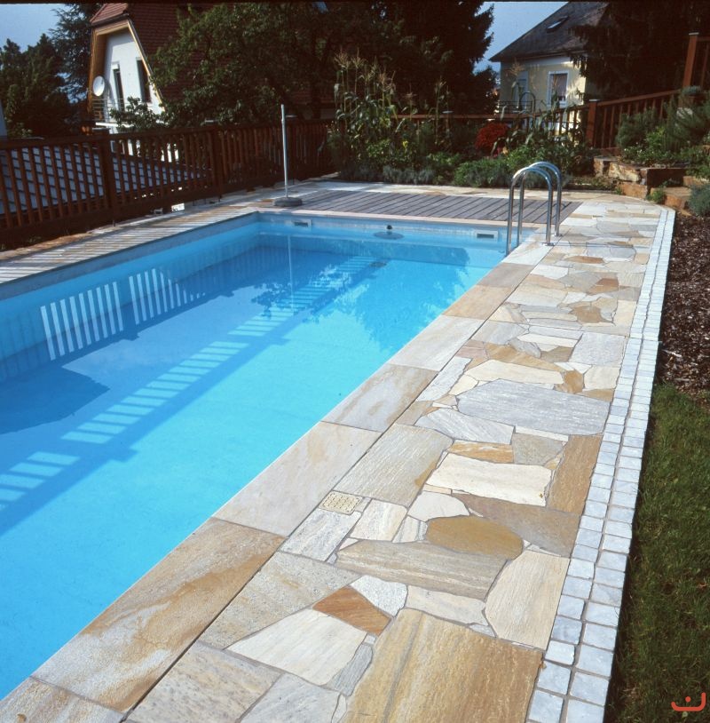 Material: Quarzit hellgelb & Marmor weiss Pflasterwürfel (8920); Polygonalplatten (9842), Schwimmbadumrandungen (9825)